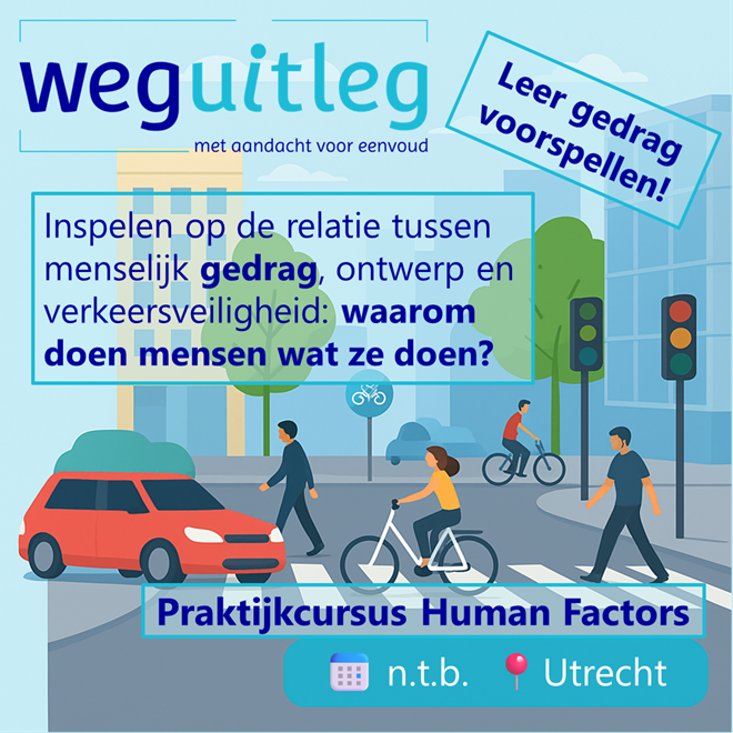 - Praktijkcursus Human Factors: In één dag leren hoe je in een ontwerp rekening houdt met de eindgebruikers, met hun capaciteiten en beperkingen? Hoe je ervoor zorgt dat het eindproduct, of het nou bestemd is voor automobilisten, fietsers, voetgangers of spelende kinderen, veilig gebruikt kan worden? Kijk dan eens naar onze eendaagse praktijkcursus Human Factors.